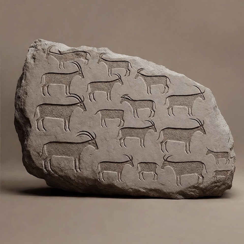A large beige stone slab features numerous engraved outlines of goats in various poses. The ancient-style petroglyphs depict goats with curved horns standing and facing different directions. The carvings are shallow and evenly spaced across the irregular surface of the rock.