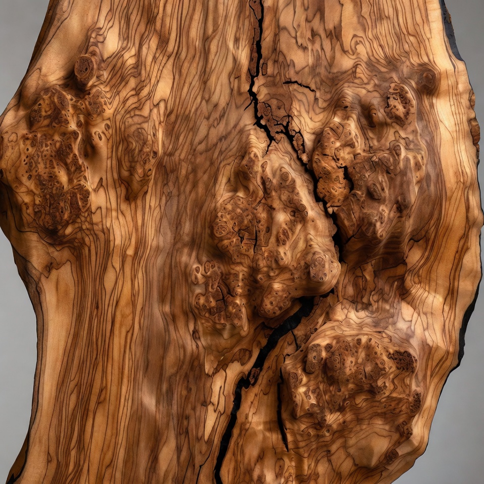 A detailed close-up view of olive wood featuring intricate grain patterns and prominent burls. Dark cracks run through the rich brown wood texture. The wood is isolated against a plain gray background.