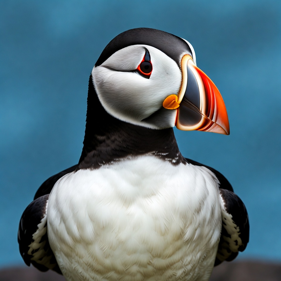animal, avian, beak, bird, black feathers, blue background, close-up, feathers, nature, orange beak, portrait, puffin bird, red eye, seabird, white feathers, wildlife, puffin