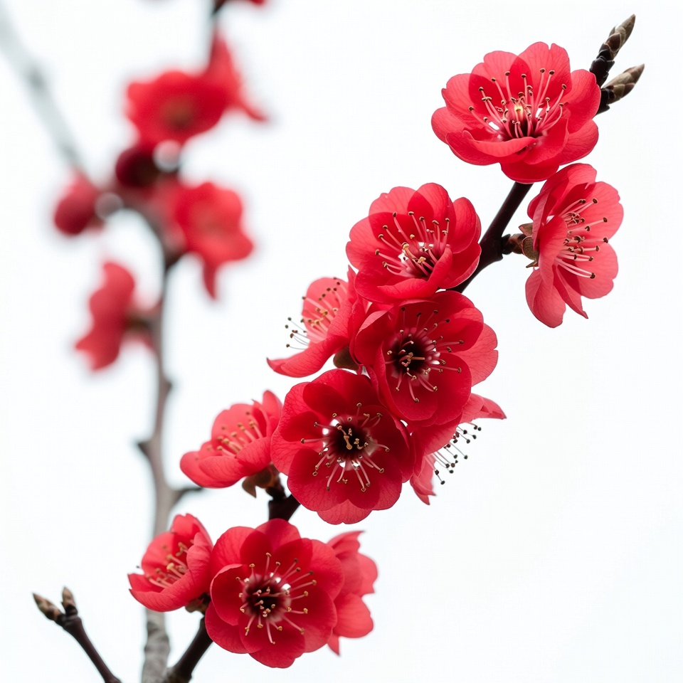 A cluster of vibrant red plum blossoms blooms along a thin brown branch. The delicate flowers feature layered pinkish-red petals and prominent yellow stamens. The image is set against a clean white background, highlighting the blossoms' intricate details.