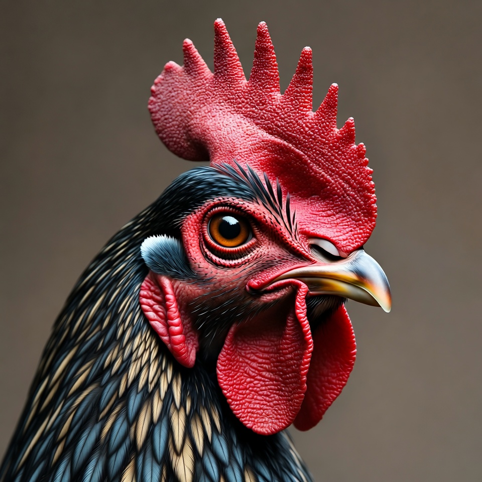 A detailed closeup of a rooster with vibrant red comb and wattle, black and gold feathers, and intense orange eye. The bird faces forward against a neutral brown background. Its beak is slightly open, showcasing intricate feather textures.