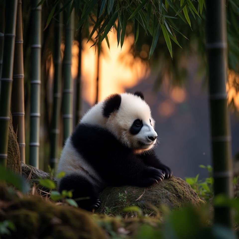 adorable panda, animal, baby panda, bamboo forest, black white fur, cute panda, green bamboo, isolated background, mossy rock, panda cub, panda eyes, panda paws, sitting panda, sunset light, wildlife, panda