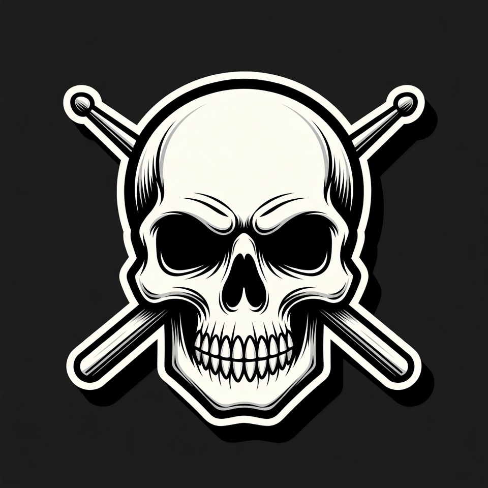 black background, bold outline, clipart, crossed drumsticks, death metal, drummer skull, drumsticks, graphic design, heavy metal, illustration, isolated background, music symbol, punk skull, rock skull, skeletal face, sticker style, tattoo design, vector art, white skull, skull