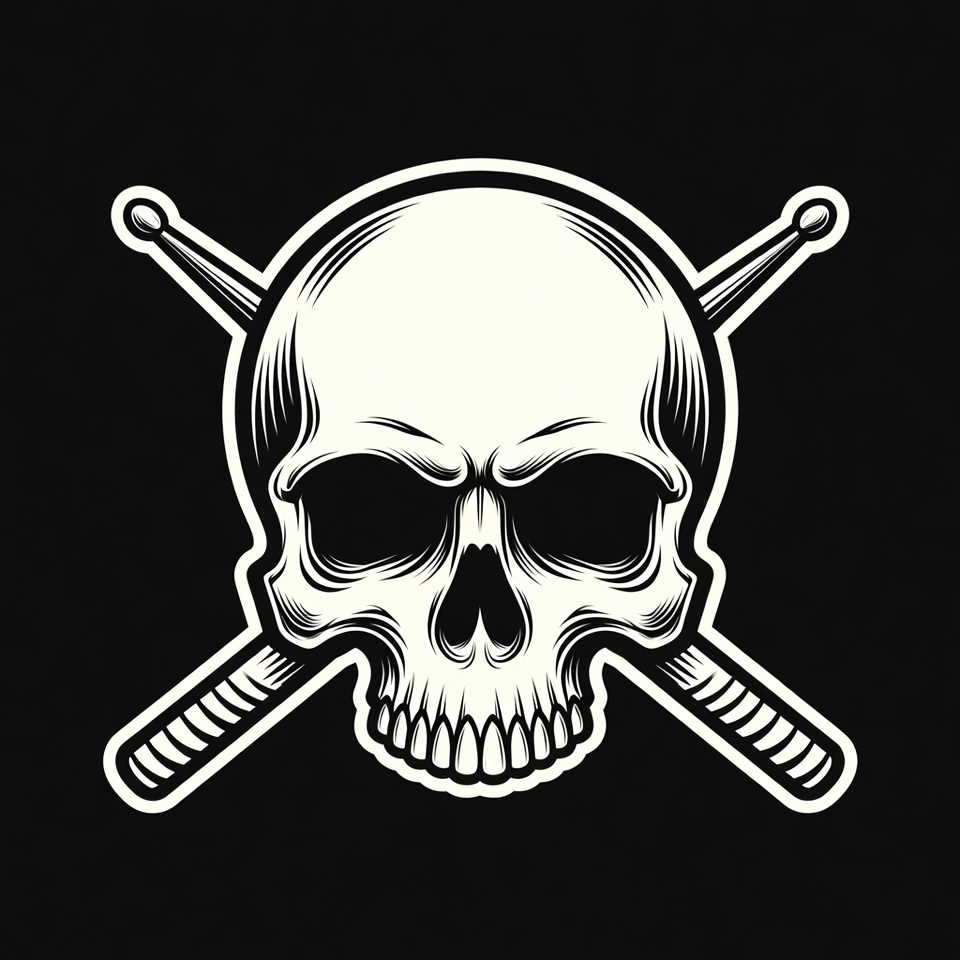 black white, crossed drumsticks, death metal, drummer skull, drumsticks, graphic design, heavy metal, illustration, isolated background, line art, music skull, punk skull, rock skull, tattoo design, vector art, skull