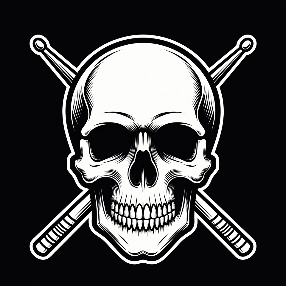black white, clipart, crossed drumsticks, drummer skull, drumsticks, graphic design, heavy metal, illustration, isolated background, music skull, punk skull, rock skull, tattoo design, vector art, skull