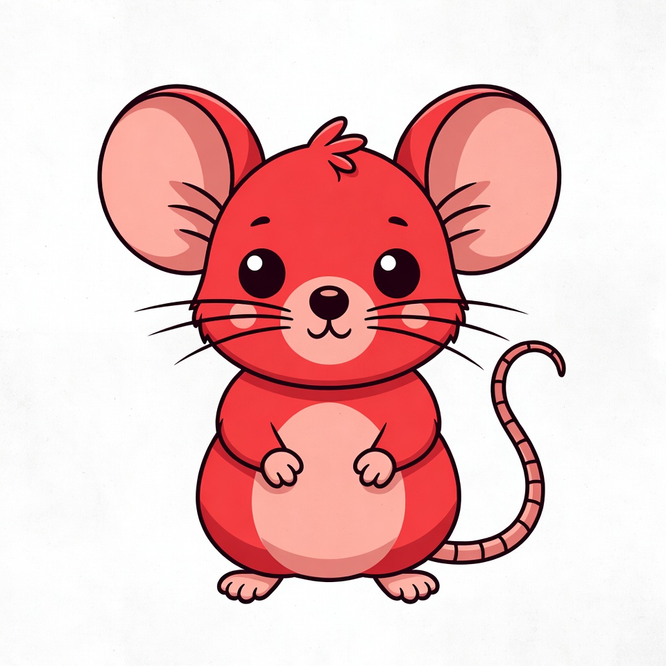 A kawaii-style cartoon mouse with bright red fur and large pink ears stands on a white background. It has big sparkling eyes, pink cheeks, whiskers, and a long tail. The chubby mouse smiles happily with its paws held in front.