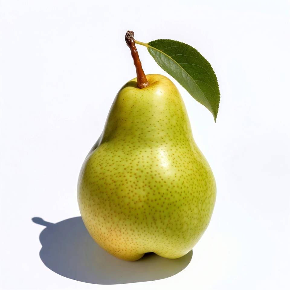 A fresh green pear with a brown stem and green leaf stands on a white background. The pear has a smooth, slightly speckled surface and a subtle shadow beneath it. The leaf attaches to the stem at the top of the fruit.
