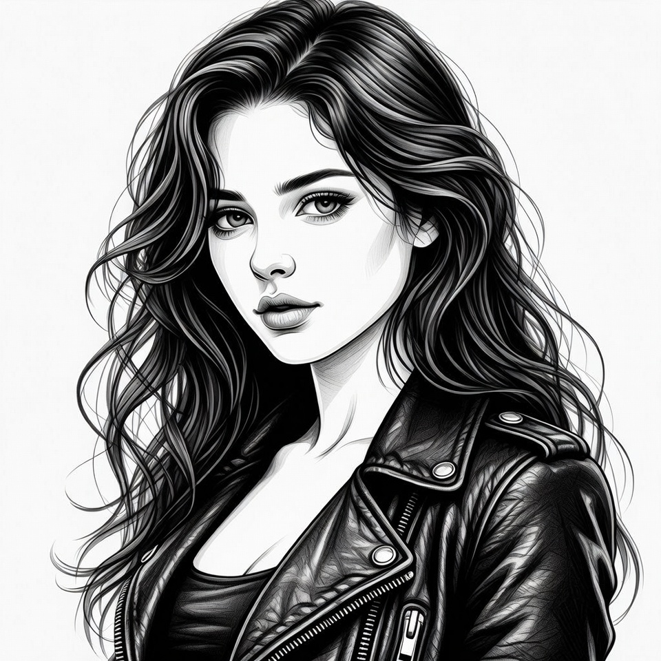 beautiful woman, black and white, black hair, closeup, detailed drawing, drawing, edgy look, face, fashion illustration, female, green eyes, illustration, leather jacket, lips, long hair, pencil sketch, portrait, realistic art, stylish woman, wavy hair, young woman, woman