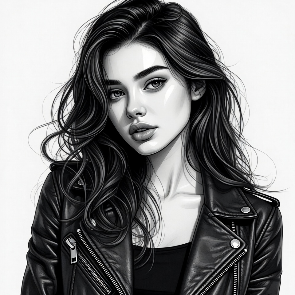 A young woman with long wavy black hair gazes at the viewer in a detailed black and white illustration. She wears a black leather jacket with silver zippers over a top, set against an isolated white background. Her expressive eyes and subtle makeup highlight her striking facial features.