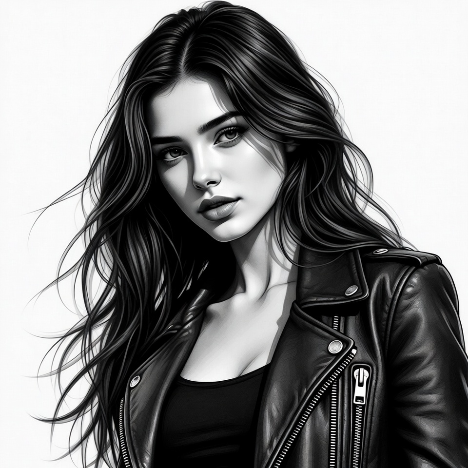 White, art portrait, beautiful, biker jacket, black and white, black hair, closeup face, detailed drawing, digital art, edgy style, female, female portrait, flowing hair, glossy hair, illustration, leather jacket, long hair, monochrome, portrait, realistic portrait, serious expression, striking eyes, white background, young woman, woman