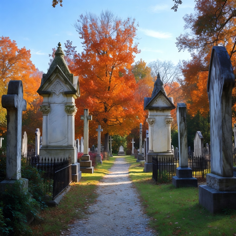 autumn, autumn colors, blue sky, burial ground, cemetery walk, fall cemetery, fall foliage, grass, gravestone path, gravestones, graveyard, headstones, iron fence, maple trees, mausoleums, orange trees, ornate tombs, pathway, red leaves, seasonal cemetery, stone memorials, tombstones, tree lined path, vibrant fall, cemetery