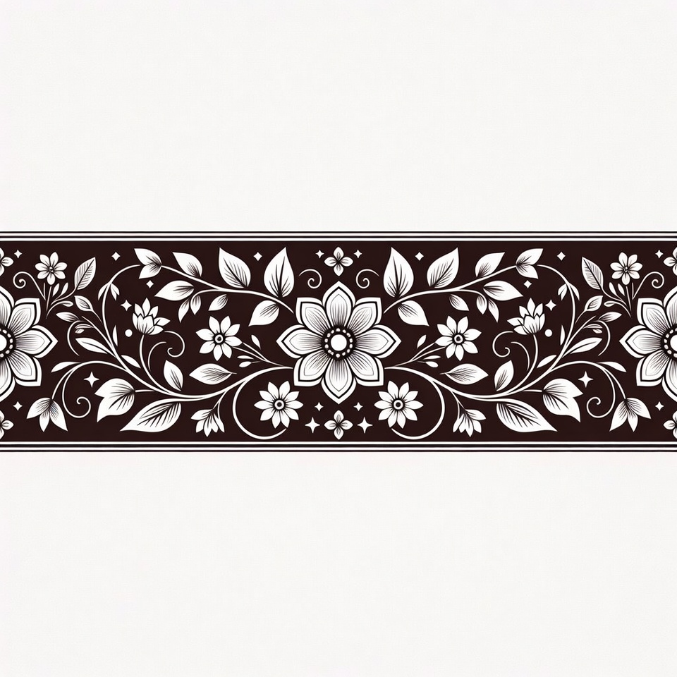 artistic border, border graphic, botanical design, clipart, daisy flowers, decorative border, decorative element, elegant border, engraving style, floral garland, floral ornament, flower pattern, illustration, isolated background, leaf motifs, line art, ornamental design, pattern border, seamless border, symmetrical design, vector border, vine border, white flowers, white line art, floral border