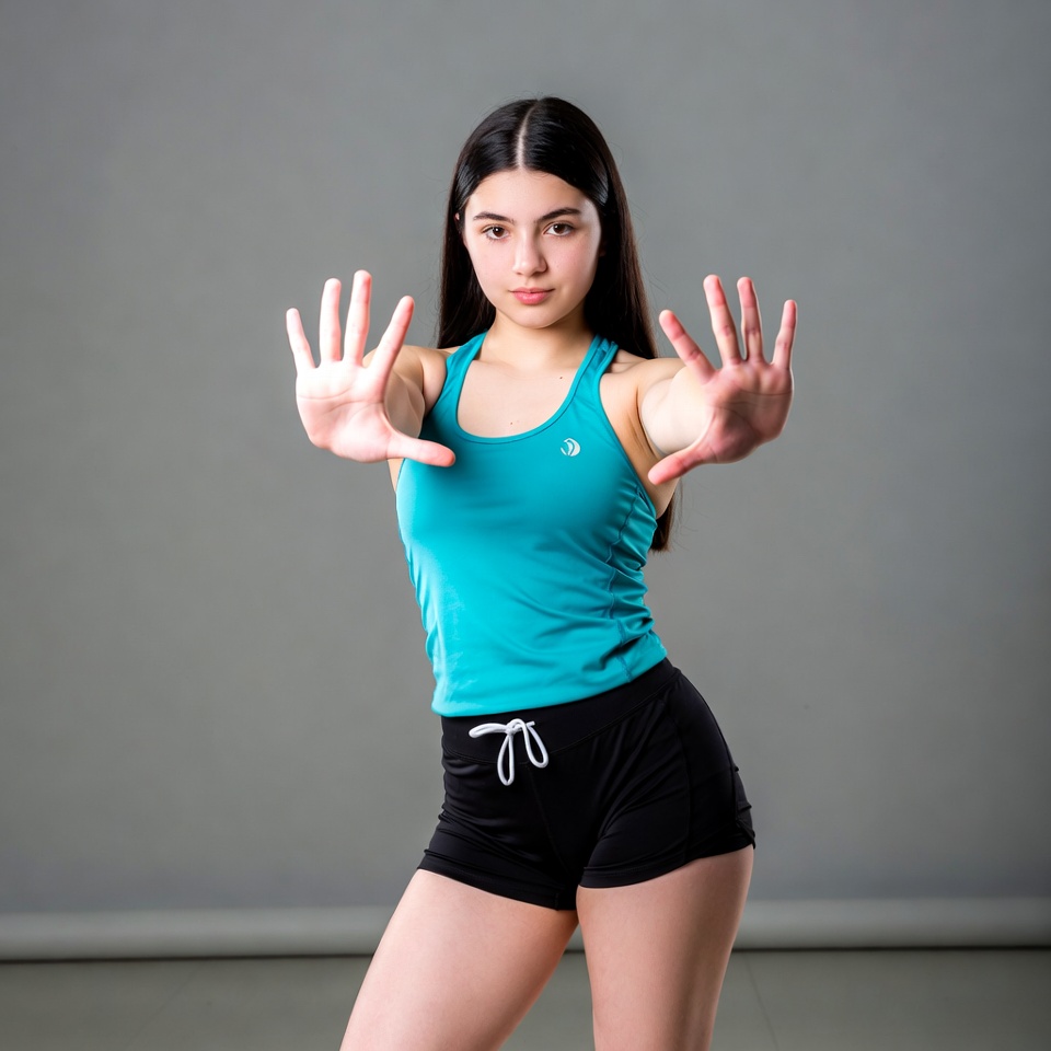 A young woman with long dark hair stands against a gray background, extending both arms forward with open hands in a stopping gesture. She wears a teal tank top and black drawstring shorts, showing a fit athletic build. Her expression is direct and engaging.