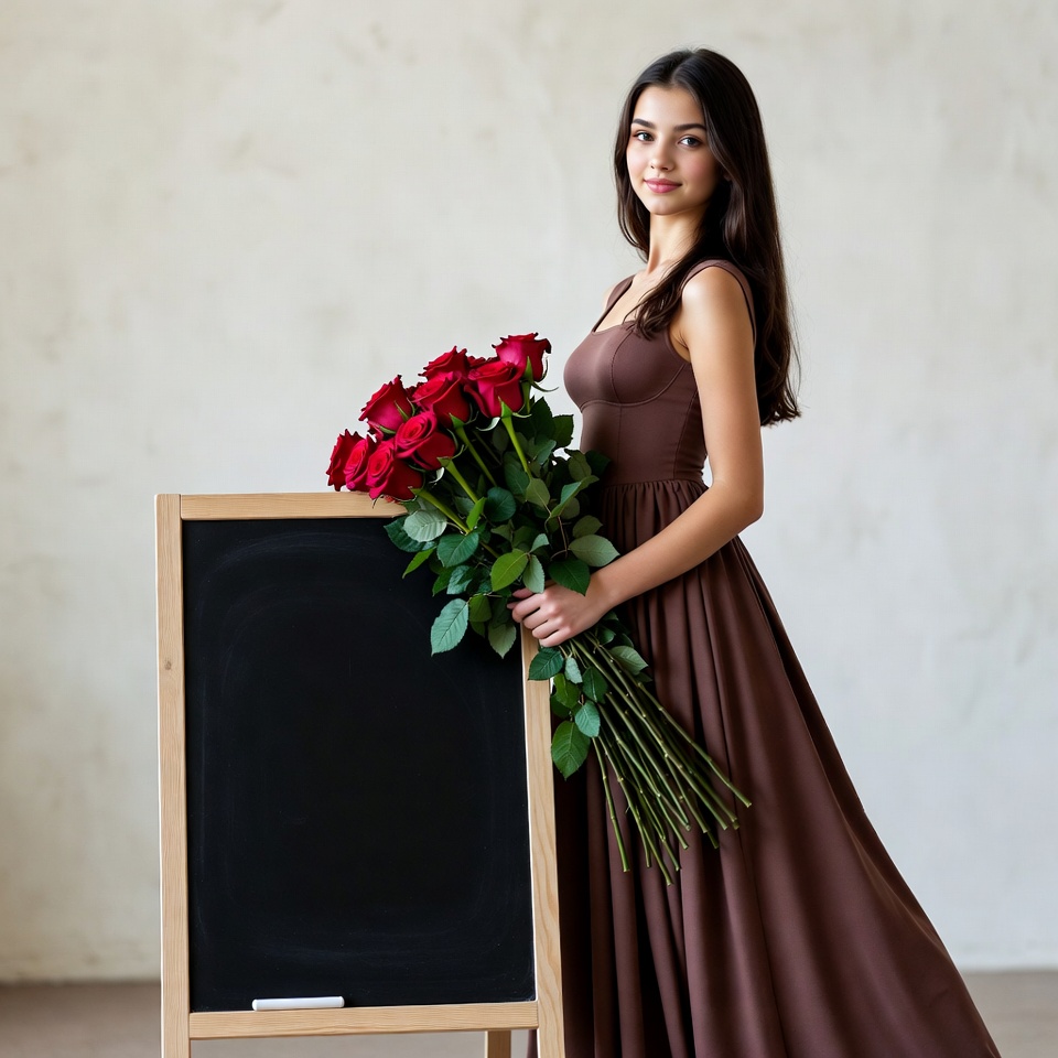 A young woman with long dark hair stands beside a wooden blackboard, holding a large bouquet of vibrant red roses. She wears a flowing brown sleeveless dress and smiles at the camera. The background is a plain light-colored wall.