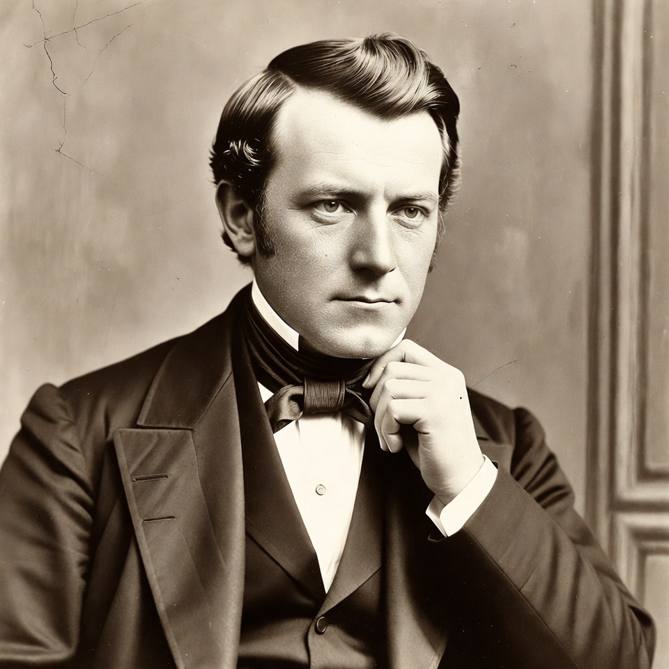 A man with side-parted dark hair and a serious expression sits posed for a portrait. He wears a black Victorian-era suit with a white shirt, black bow tie, and vest. His right hand is raised to touch his chin against a plain studio background.