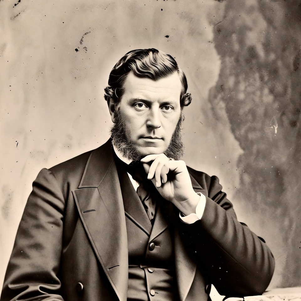 A man with curly side-parted hair and a full beard sits in a formal dark suit with vest and tie. He rests his chin thoughtfully on his hand against a plain studio background. The sepia-toned photograph captures intricate details of his Victorian-era attire and serious expression.