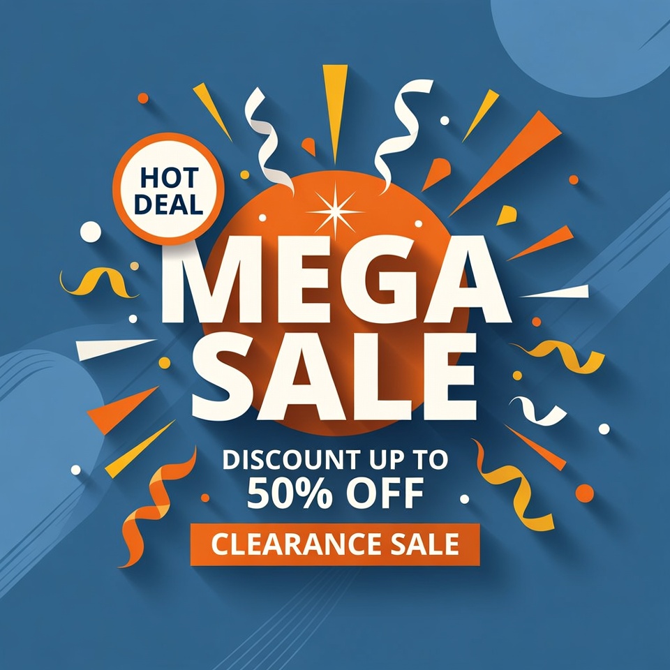 50% off, advertisement, blue background, clearance sale, confetti, discount, flat design, graphic design, hot deal, orange accents, promotion, ribbons, sale banner, sale graphic, shopping deal, starburst, vector art, mega sale