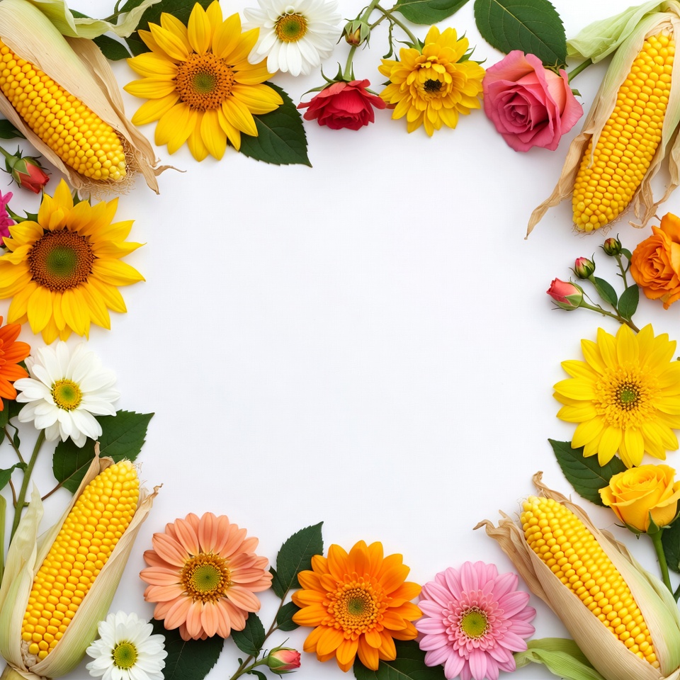 A circular border of fresh corn cobs and various colorful flowers surrounds a blank white center. Bright yellow sunflowers, white daisies, red and pink roses, orange gerbera daisies, and green leaves form the vibrant arrangement. The isolated design is arranged symmetrically on a white background.