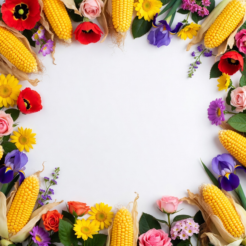 A circular arrangement of yellow corn ears surrounds vibrant flowers including red poppies, pink roses, yellow daisies, purple irises, and green leaves. The composition features a large empty white space in the center on a plain white background. Various colorful blooms and corn husks create a festive floral border.