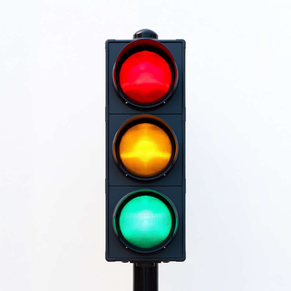 black pole, green light, isolated, red light, road sign, signal, stoplight, three lights, transportation, vertical, white background, yellow light, traffic light
