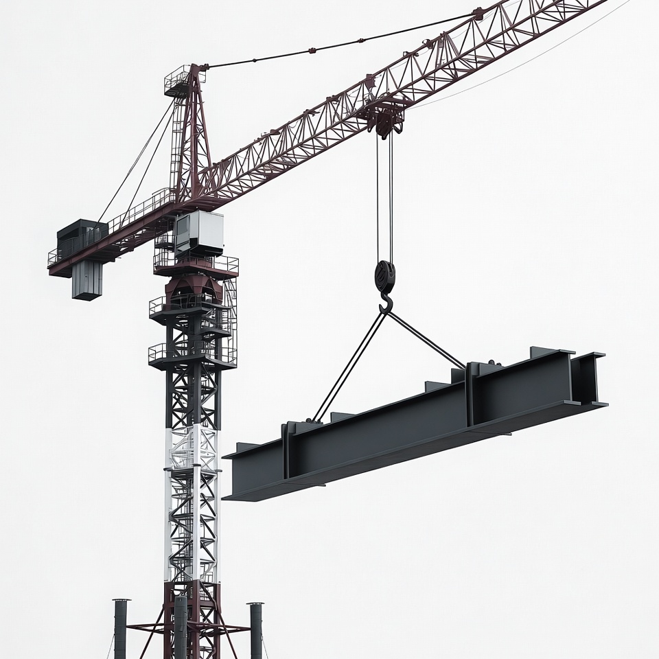 A tall red tower crane lifts a large steel I-beam with its hook and cables. The crane stands on a white isolated background, showcasing its lattice structure and counterweight. The steel beam hangs suspended mid-air from the crane's hoist.
