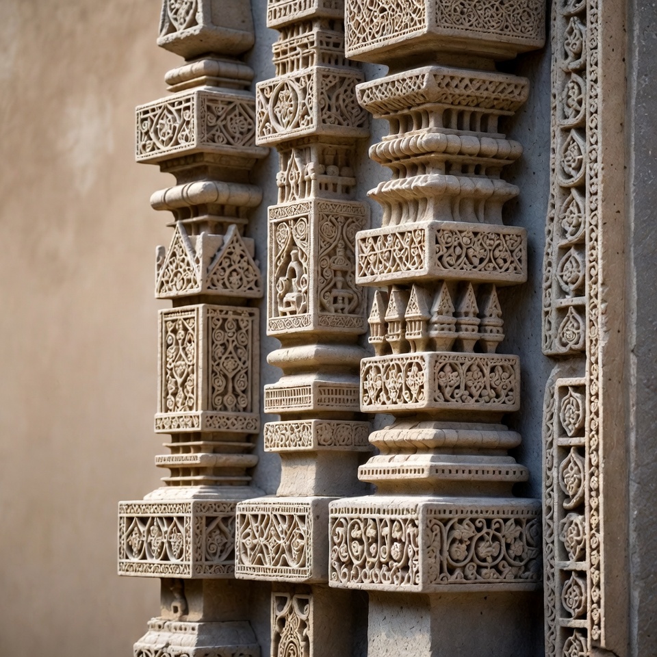 Indian architecture, ancient carvings, architecture, beige stone, carved stone, carvings, columns, decorative pillars, detailed sculptures, floral designs, geometric motifs, heritage site, intricate patterns, monumental pillars, motifs, ornate, pillars, reliefs, sandstone, sculptural details, stacked blocks, stonework, temple architecture, traditional architecture, stone pillars