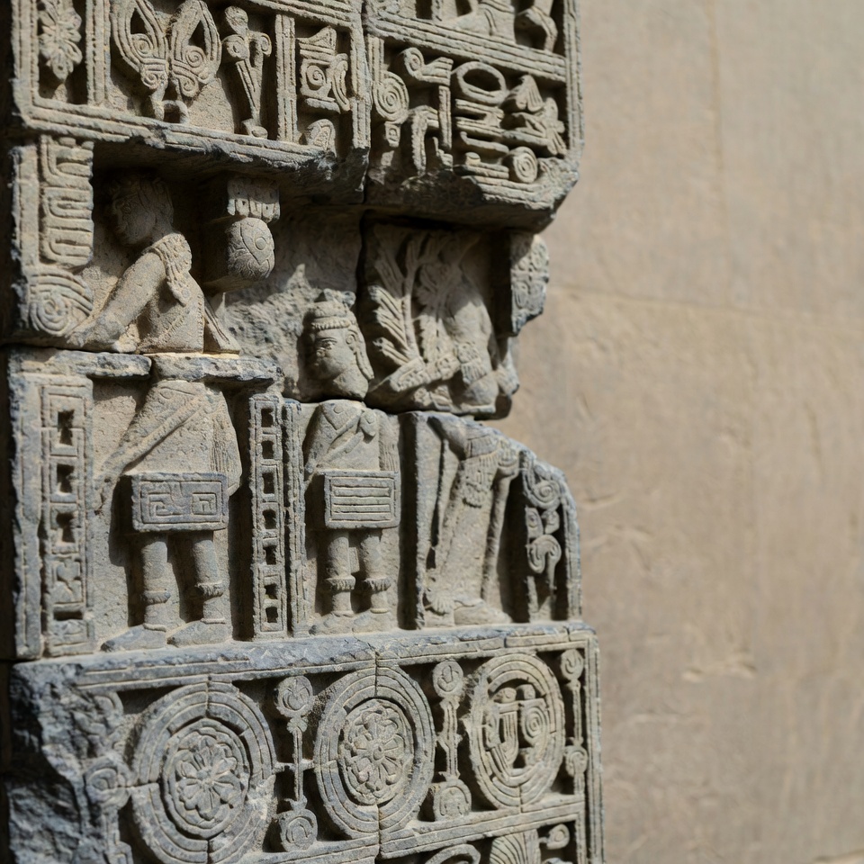 Asian, Indian art, ancient India, ancient sculpture, architecture, beige stone, carved figures, carved panel, cultural heritage, figures standing, floral motifs, geometric patterns, headdresses, historical, human figures, intricate designs, relief panel, sculpture detail, temple art, temple relief, traditional attire, weathered stone, stone carving