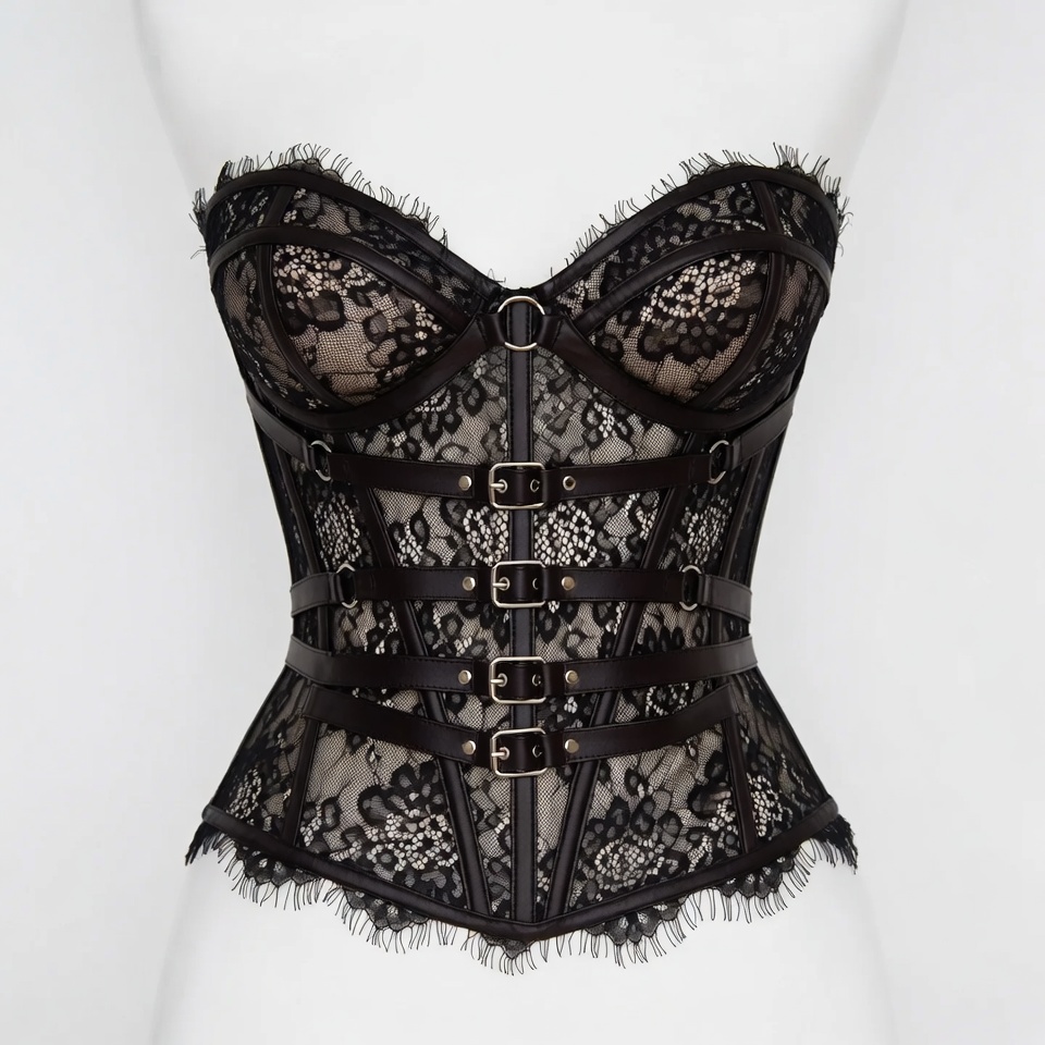 black corset, black lace, buckles, bustier, fashion, harness corset, isolated background, lace corset, leather harness, lingerie, mannequin, sexy lingerie, straps, torso, undergarment, corset