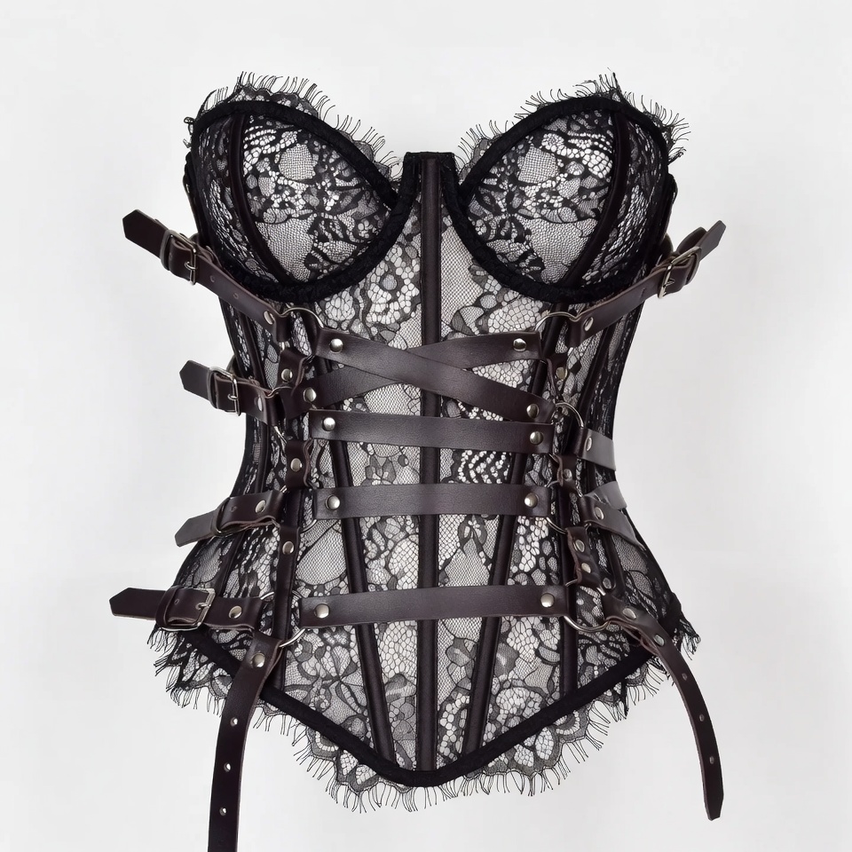 A black corset features intricate lace panels combined with multiple leather straps and buckles. It has a bustier-style top with scalloped lace edges and adjustable straps. The design is displayed against a plain white background.