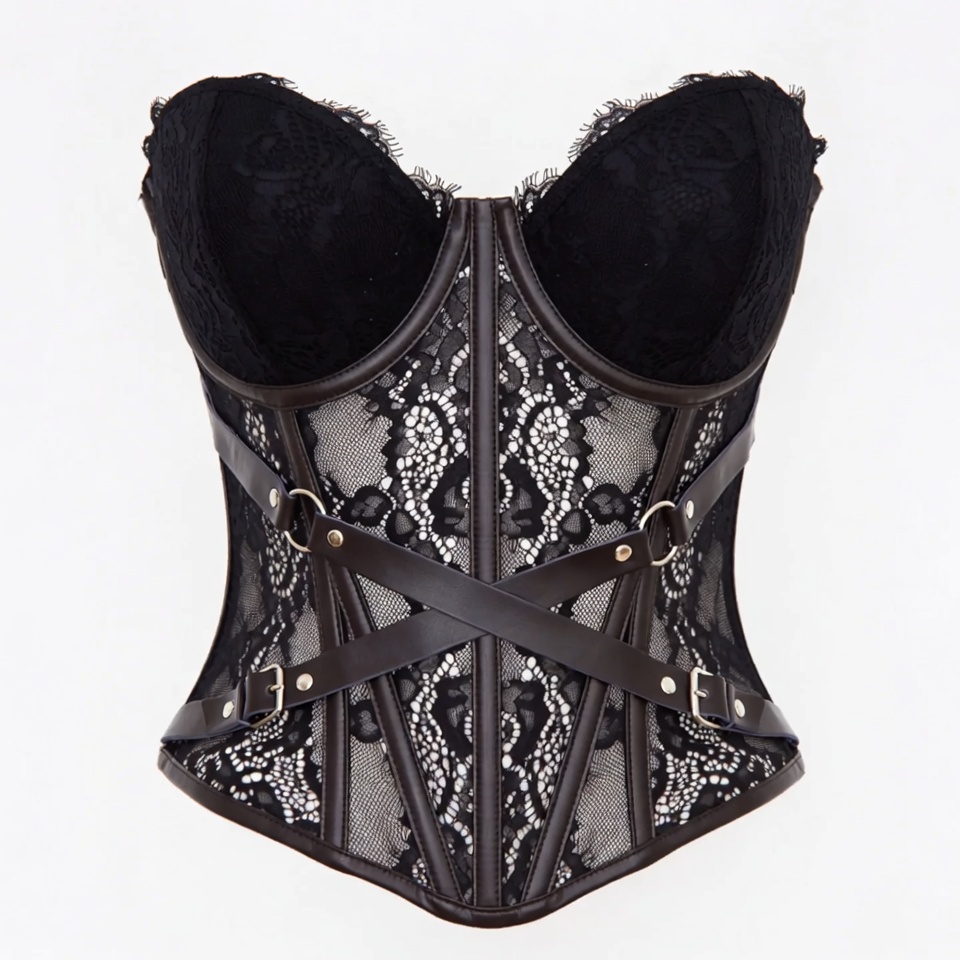 balconette corset, black corset, black lace, buckles, bustier, fashion lingerie, harness corset, isolated background, lace corset, lace design, leather corset, lingerie, sexy lingerie, straps, undergarment, corset