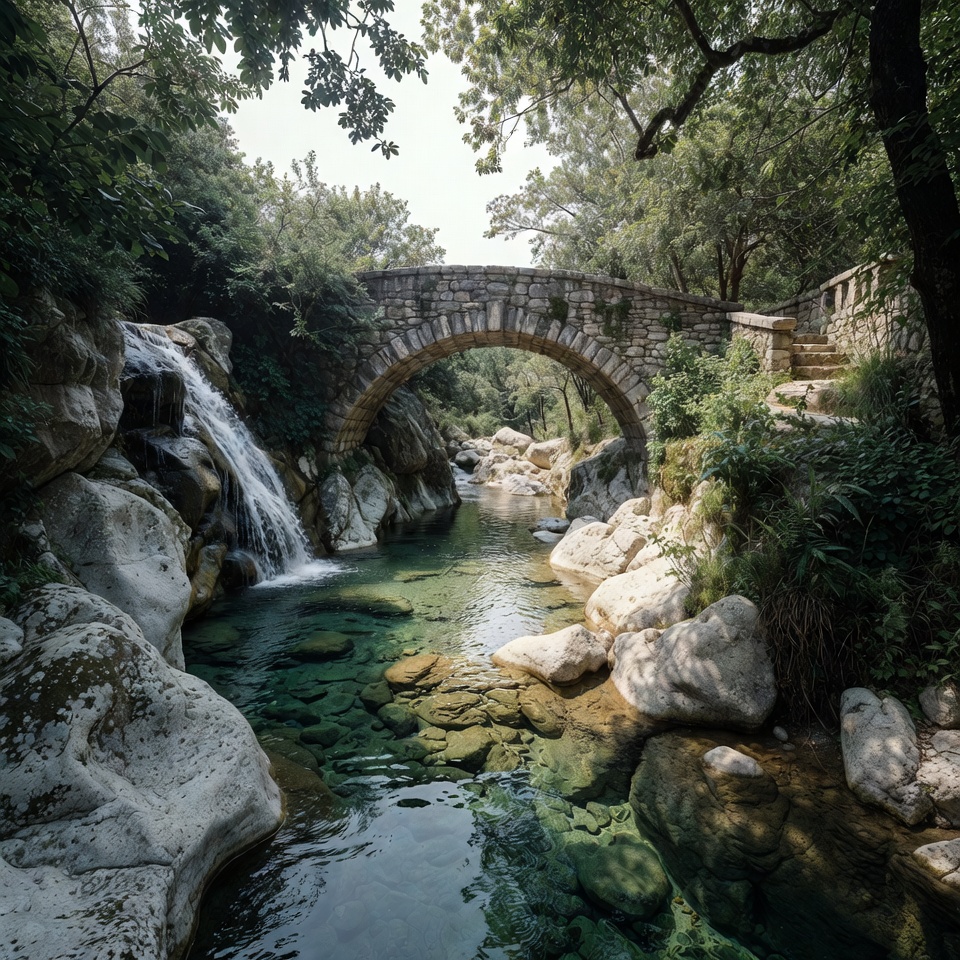 A picturesque stone arch bridge spans a clear turquoise river with a cascading waterfall beneath it. Lush green trees and foliage surround the scene, with large white rocks lining the riverbanks. Sunlight filters through the canopy, illuminating the vibrant water.