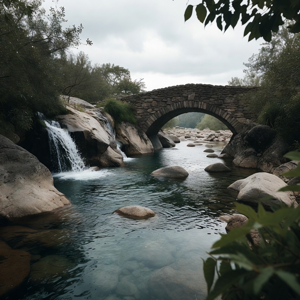 A stone arch bridge spans a clear river with a small waterfall cascading beneath it. Surrounding the scene are lush green trees, smooth rocks, and calm turquoise water. The sky is overcast, framing the natural landscape.