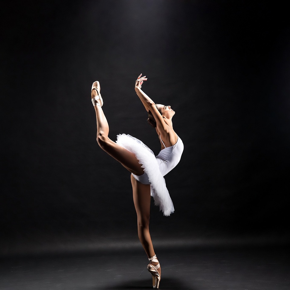 arabesque, arms raised, ballet dancer, ballet pose, ballet slippers, classical ballet, dance performance, dance pose, dark background, female, graceful pose, isolated background, leg extension, performing arts, pointe shoes, spotlight, stage lighting, tutu, white tutu, woman, ballerina