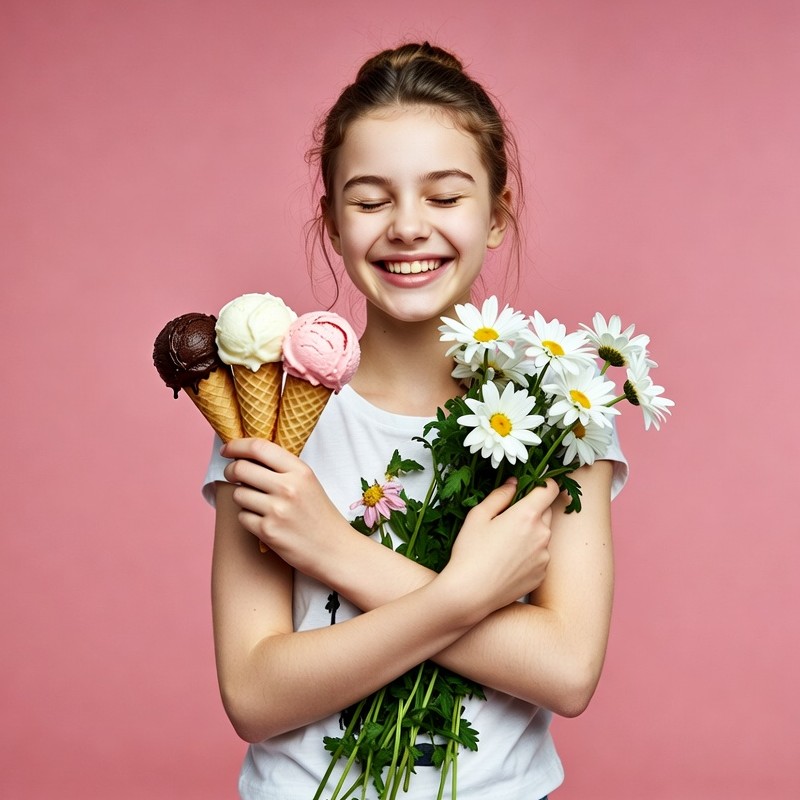 A young girl with long brown hair in a bun smiles joyfully while holding a bouquet of white daisies in one arm and several colorful ice cream cones in the other. She wears a white t-shirt with a pink floral print and stands against a solid pink background. The ice creams include chocolate, vanilla, strawberry, and pink varieties.