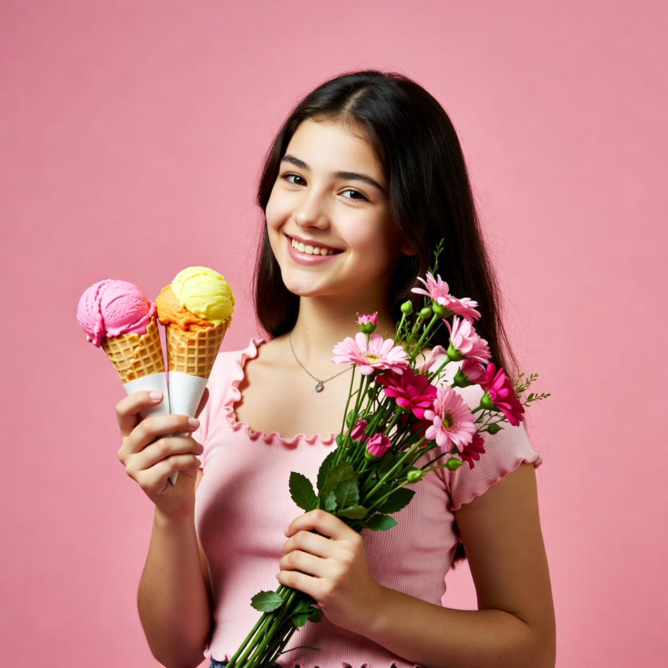 A smiling young girl with long dark hair holds two colorful ice cream cones in one hand and a bouquet of pink flowers in the other. She wears a pink ruffled top and stands against a bright pink background. The ice cream features pink, yellow, and orange scoops.