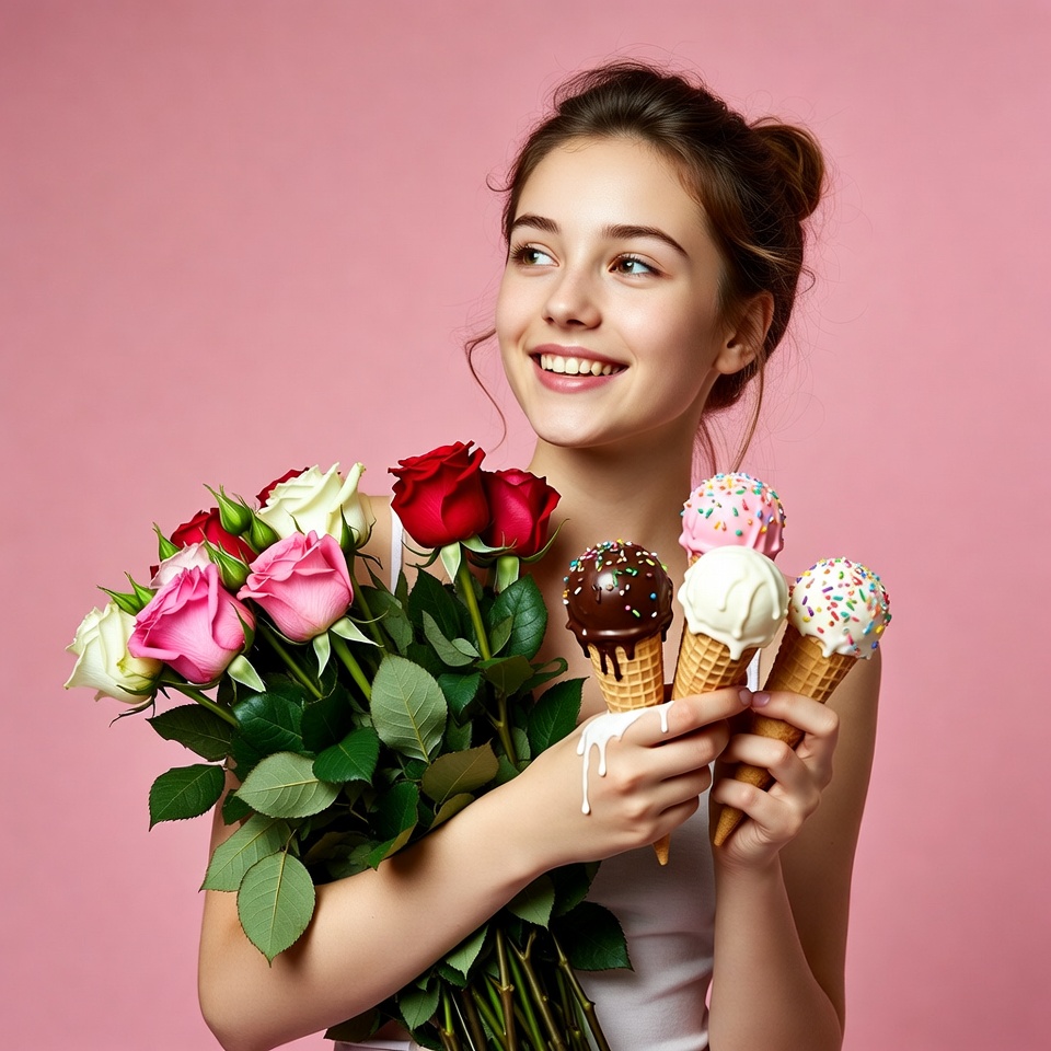 A young woman with brown hair in a bun smiles while holding a bouquet of red, pink, and white roses. She also holds multiple ice cream cones topped with chocolate, vanilla, and sprinkles. The image features a bright pink background.