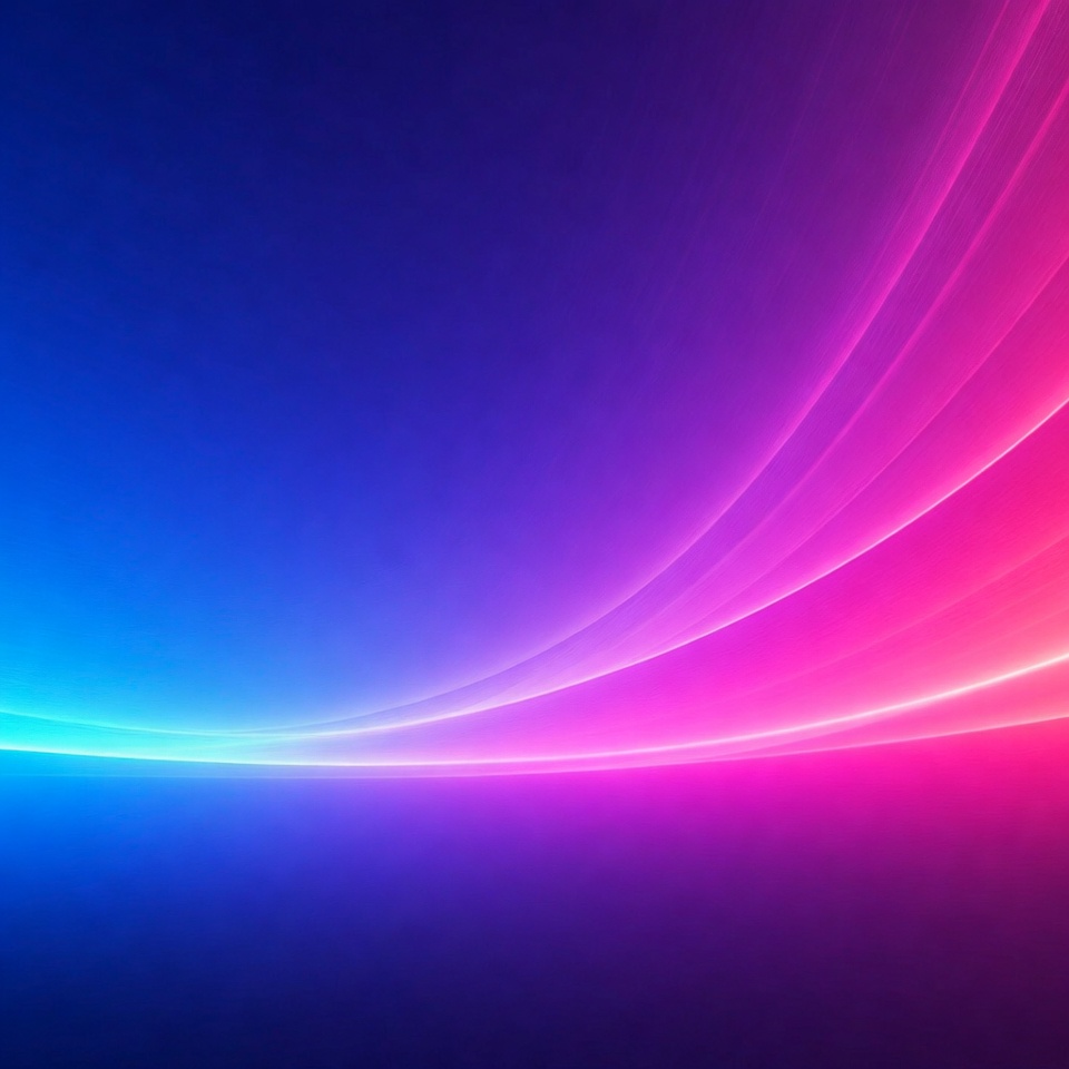 An abstract digital artwork features smooth, glowing waves in shades of deep blue transitioning to vibrant purple and hot pink. The curves sweep diagonally across a dark background, creating a dynamic flow of neon-like light trails. The design has a glossy, futuristic appearance with soft gradients and highlights.