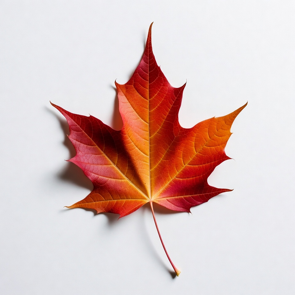 autumn leaf, fall leaf, foliage, isolated leaf, leaf stem, leaf veins, nature, orange hues, plant leaf, pointed lobes, red leaf, seasonal, vibrant red, white background, maple leaf