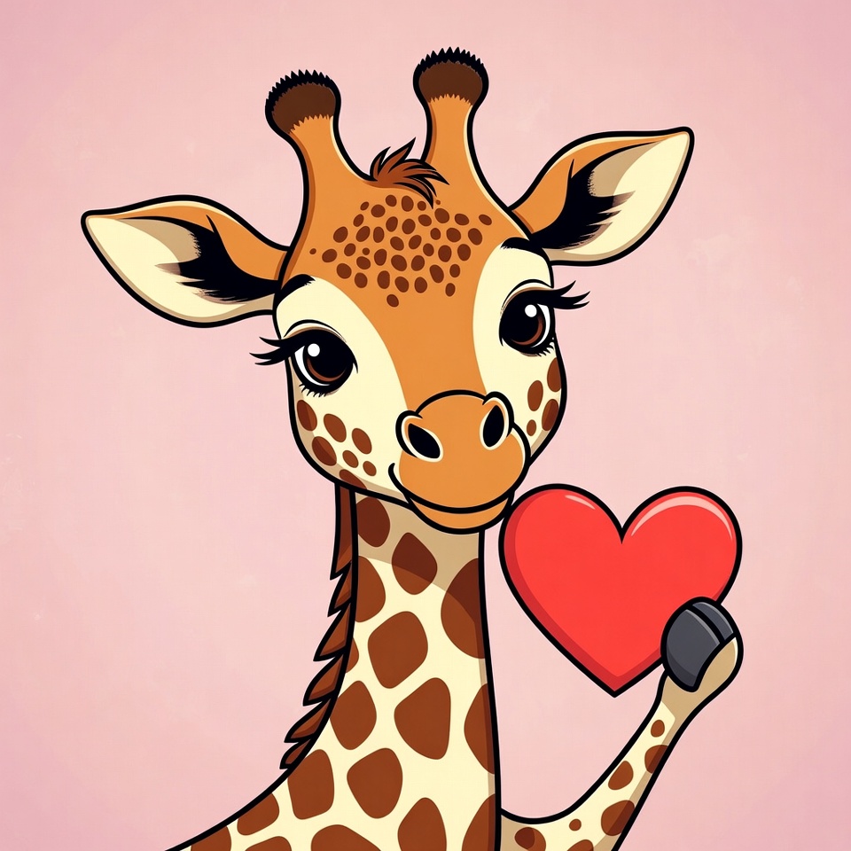 A cartoon giraffe with large expressive eyes and spotted brown coat holds a bright red heart in its hoof against a pink background. The giraffe has long eyelashes and a friendly smile. It stands isolated on the solid pink backdrop.