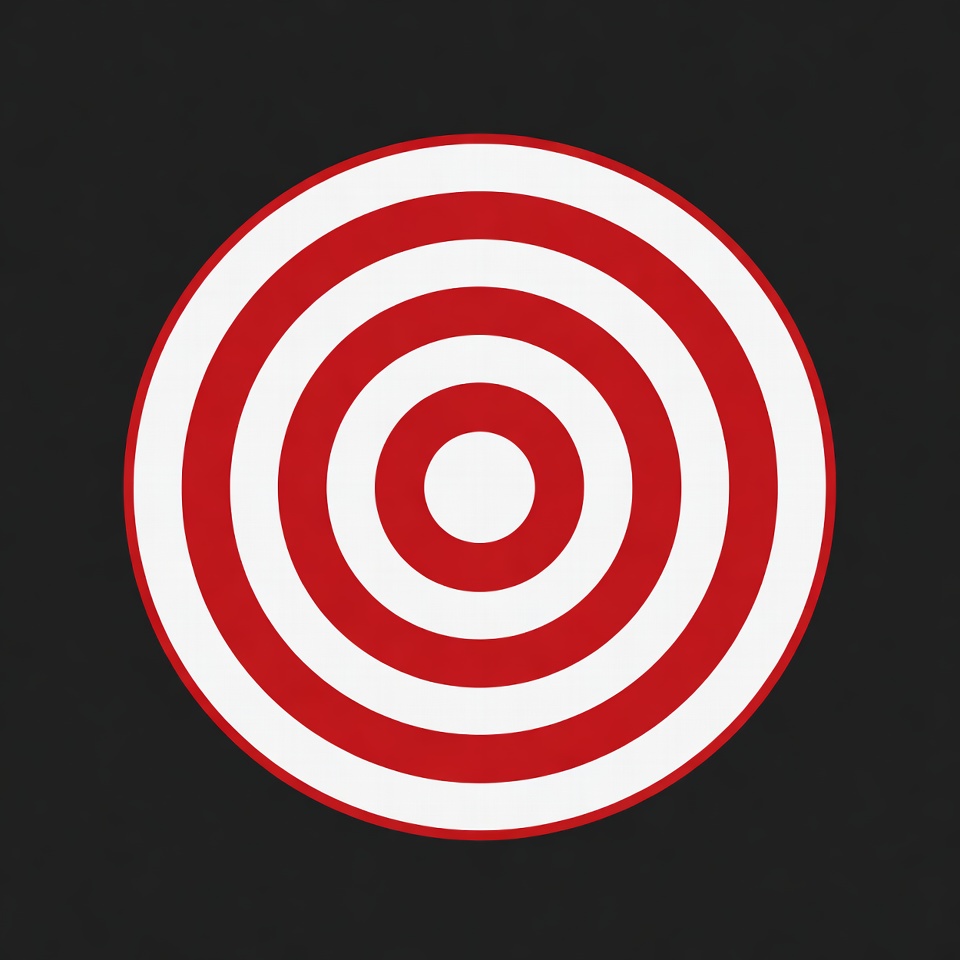 A classic red bullseye target features multiple white concentric circles on a black background. The center is a small white circle surrounded by alternating red and white rings. The design is simple and isolated.