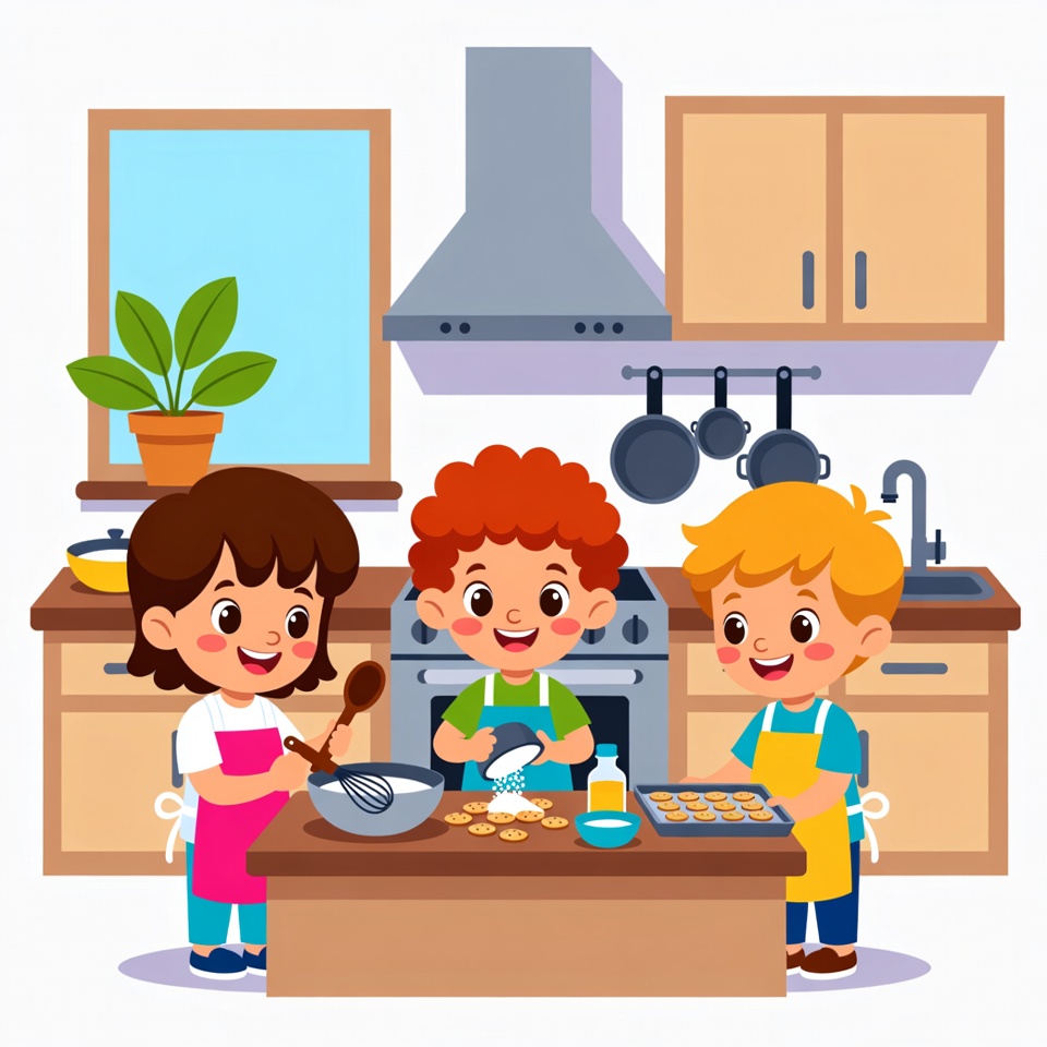 Three cartoon children with brown, red, and blonde hair are baking cookies together in a bright kitchen. A girl in a pink apron stirs batter in a bowl, a red-haired boy scoops dough onto a tray, and a blonde boy holds a mixing spoon. Wooden cabinets, a stove, sink, and potted plant surround the wooden countertop.