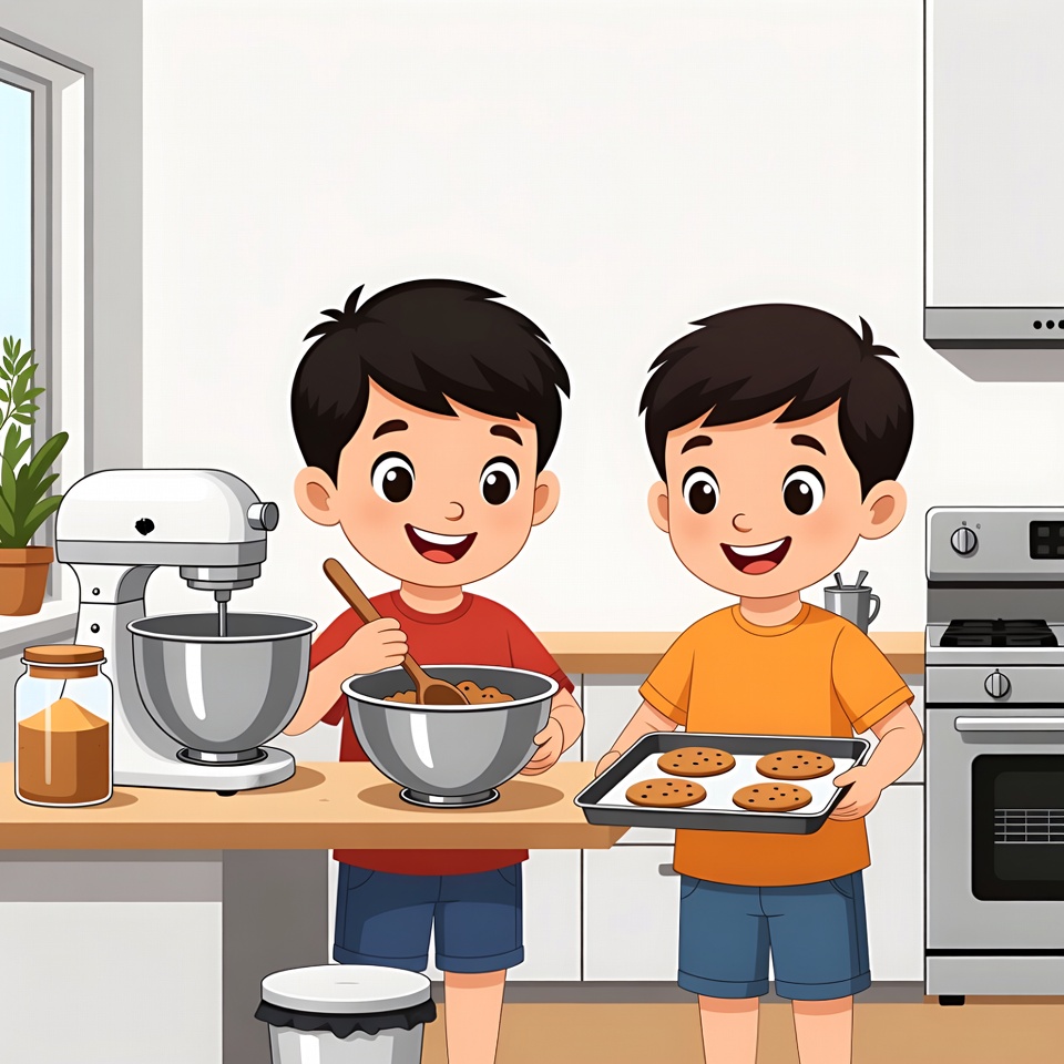 Asian, baking, baking tray, cartoon, children, cookies, cooking, counter, dough, food prep, happy, illustration, kids, kitchen, mixing bowl, oven, plants, smiling, stand mixer, stirring, white cabinets, window, wooden spoon, young boys, boys