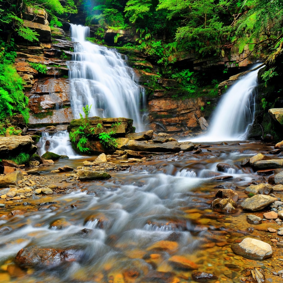 cascade, cliffs, flowing water, forest, green foliage, jungle waterfall, landscape, lush vegetation, mountain scenery, multi-tiered falls, natural beauty, nature, rocks, rocky terrain, scenic view, stone bed, stream, trees, verdant forest, waterfall