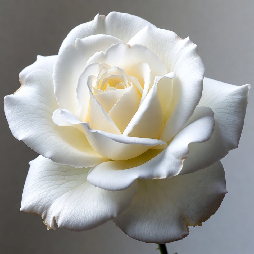 A pristine white rose is captured in close-up against a smooth gray background. The petals are fully unfurled, displaying intricate layers and delicate edges. A short green stem supports the flower.