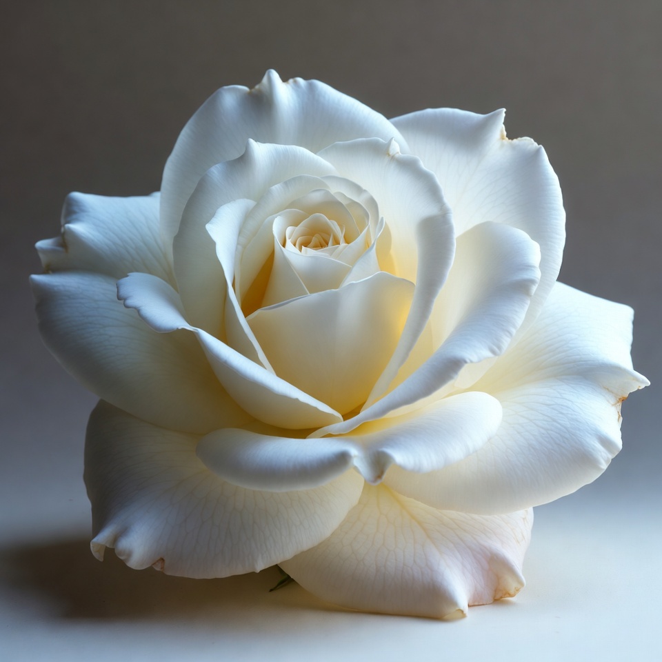 A single white rose is centered in the frame with delicate petals unfurling from the core. The flower features soft, ruffled edges and a subtle gradient towards the center. It is isolated against a neutral gray background.