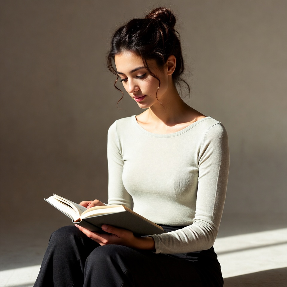 A young woman with dark curly hair in a bun sits cross-legged, intently reading an open book. She wears a light beige long-sleeve top and black pants against a plain light gray background. Soft natural light illuminates her focused expression and the pages of the book.