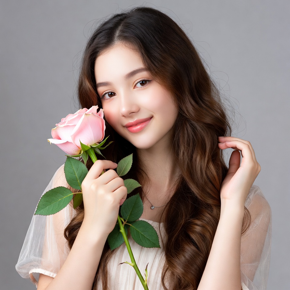 A young Asian woman with long wavy brown hair holds a pink rose close to her face against a gray background. She wears a sheer white off-shoulder top and a delicate necklace, smiling softly with her hand gently touching the flower. Her eyes are expressive and her lips lightly glossed.