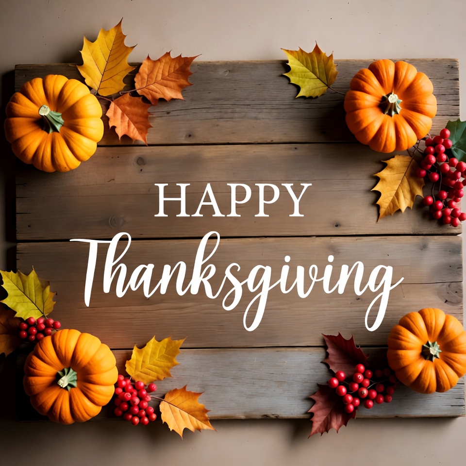 A rustic wooden sign displays 'Happy Thanksgiving' in elegant white script letters. It is framed by orange pumpkins, vibrant yellow and orange autumn leaves, and red berries. The arrangement is centered on a neutral background.