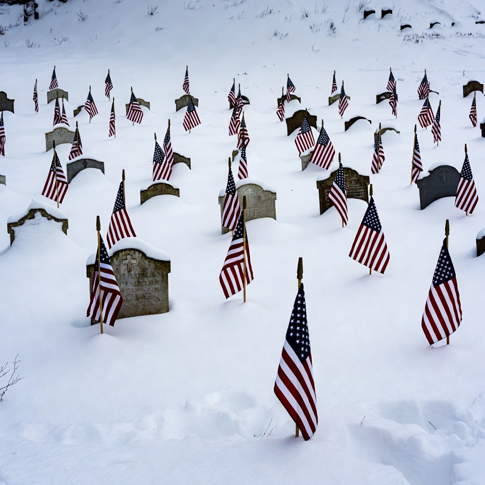 American Flags on Snowy Cemetery Graves