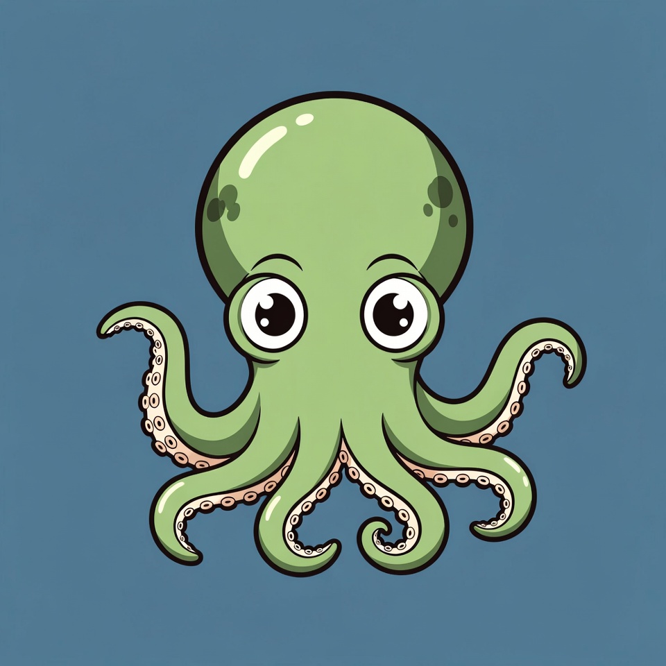 A vibrant green cartoon octopus with large expressive eyes and outstretched tentacles is illustrated on a solid blue background. The octopus features glossy highlights on its head and detailed suckers on its tentacles. It has a playful, kawaii style with bold outlines.